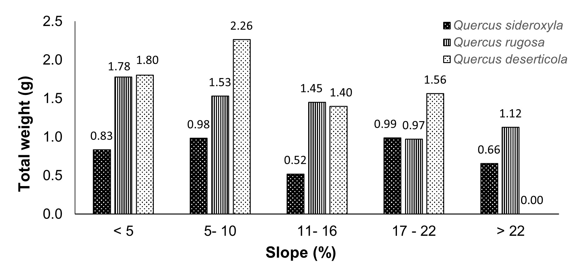 Figures 2, 3 and 4 show intervals of the categories for diameter at breast height, crown diameter and slope on the horizontal axis, to graphically represent the development of acorn weight. The highest weights of Q. rugosa and Q. deserticola were found in crown diameters lower than 11 m, while Q. sideroxyla was distributed similarly in all categories unlike Q. deserticola (Figure 2).