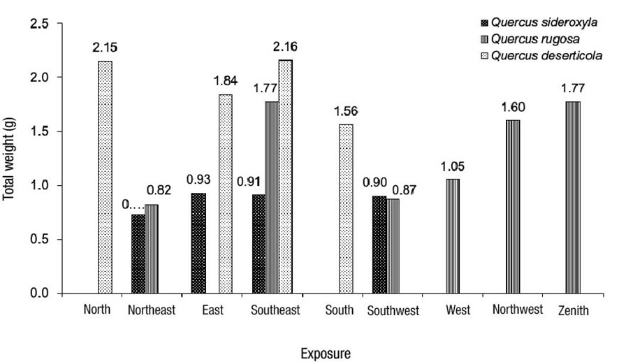 Acorn shell weight showed no significant differences (P > 0.05) between Q. sideroxyla and Q. rugosa, but significant differences were found with respect to Q. deserticola, which had the highest value (Table 2). For this species, total weight of acorns was also significantly higher than in Q. rugosa and Q. sideroxyla.