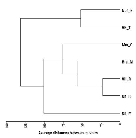 Figure 2 Clustering of seven water supply sources according to their physicochemical characteristics in the coast of Oaxaca, Mexico. Nue_E = El Nueve pond; VH_T and VH_R = Vista Hermosa tank and dam; Mm_C = Miramar waterfall; Bra_Mi = Brasil micro-watershed; Ch_R and Ch_M = Chacalapilla river and spring.