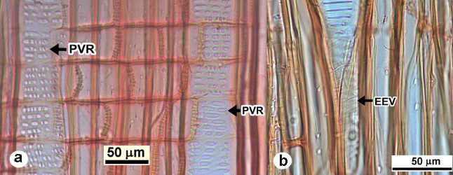 Figure 4 Radial section of Magnolia rzedowskiana: a) radial vascular-scalariform pit (RVP) and b) helical thickening in vessel element (TVE).
