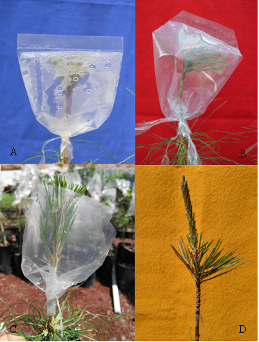 Pinus greggii scions were collected from the stock plant in the nursery and from trees in the field.