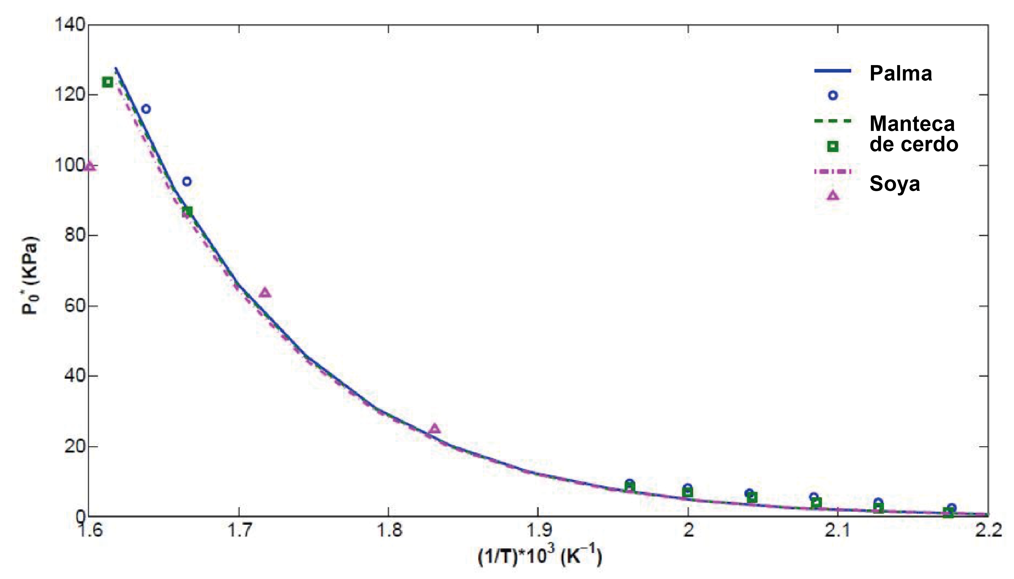 Para verificar el parámetro de ajuste óptimo, se construyeron curvas de presión de vapor saturado, representando P vs T y el modelo de Clausius-Clapeyron, para cada FAME.