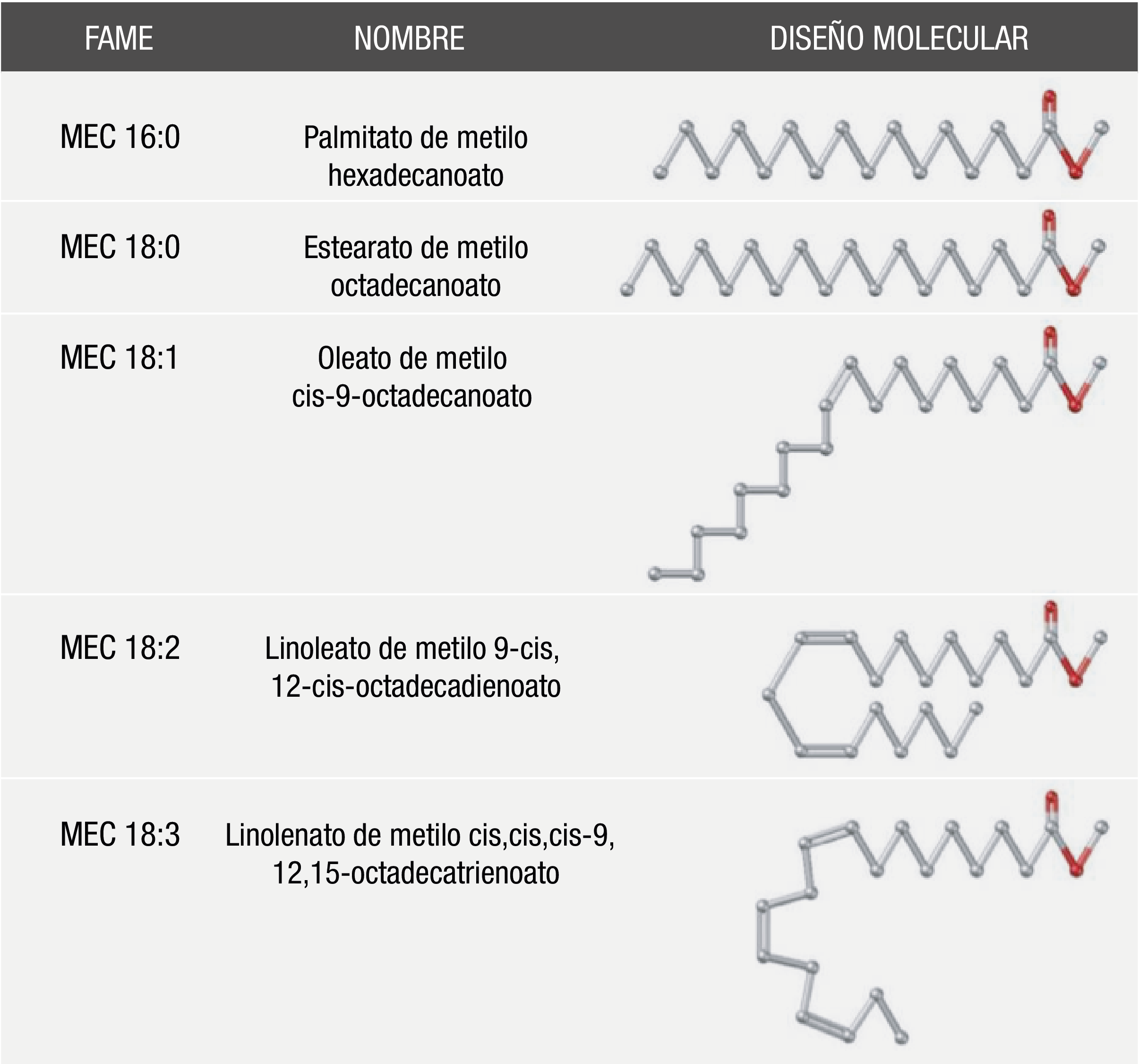 El alcohol más usado en la producción de biodiésel es el metanol, por lo que se dice que está compuesto por una mezcla de ésteres metílicos de ácidos grasos (FAMEs, por sus siglas en inglés). Además, la distribución de los FAMEs en dicho combustible depende directamente de los ácidos grasos que están presentes en el material empleado en su síntesis. Los ésteres grasos más comunes en el biodiésel (Figura 1) son los que se obtienen del ácido palmítico, esteárico, oleico, linoleico y linolénico. Esto es válido para la mayoría de las materias primas del biodiésel, como los aceites de soya, girasol, canola, palma y cacahuate (Knothe, 2010).