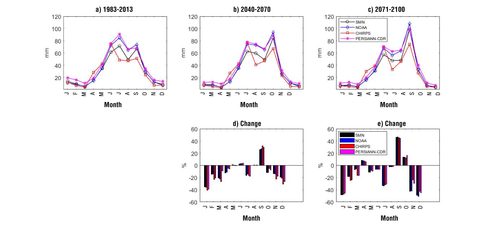 Figure 11 Annual cycles of precipitation for station 24005 in the historical period (a), the near future period 2040-2070 (b), and the far future period 2071-2100 (c), and the projected changes in precipitation between the historical and the future periods (d and e).