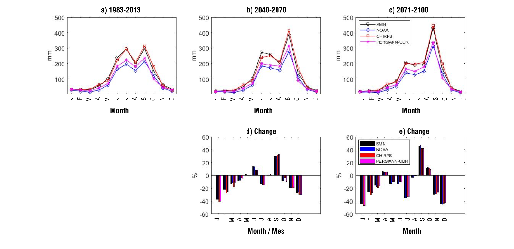 Figures 10 and 11 show the annual cycles of precipitation in historical and future periods and the projected changes in precipitation computed for station 24069 and station 24005 respectively. The climate simulations were bias corrected by using each precipitation dataset as a benchmark. From this figure, we can see that, in the historical period, the annual cycle is well represented in both stations, but not with CHIRPS data in station 24069. In addition, some differences can be noted in the amount of precipitation (relative to SMN data); for example, at station 24069, NOAA data and CHIRPS data show a higher precipitation than SMN data, while at station 24005 the opposite occurs.