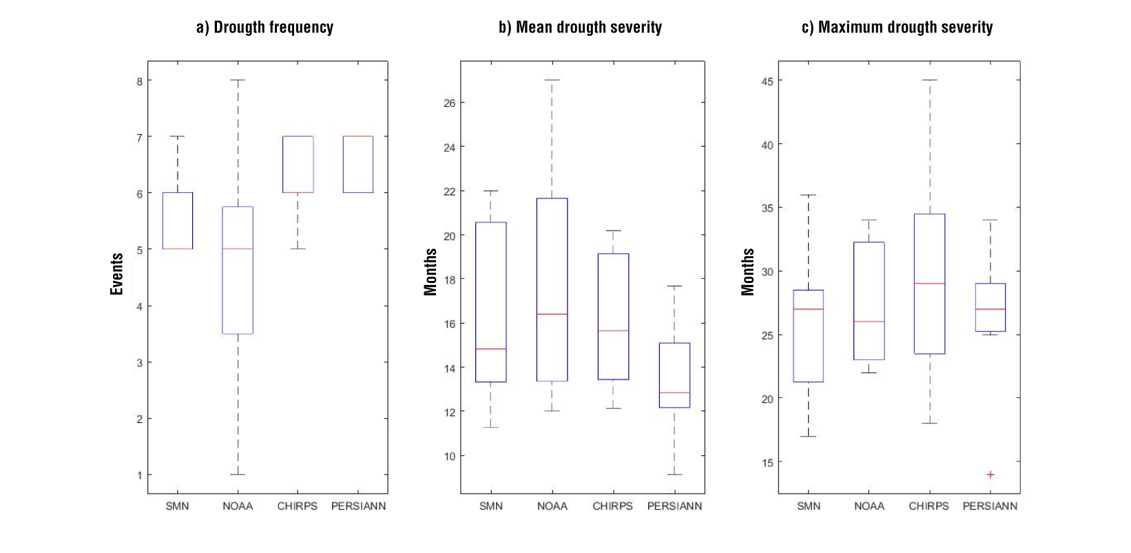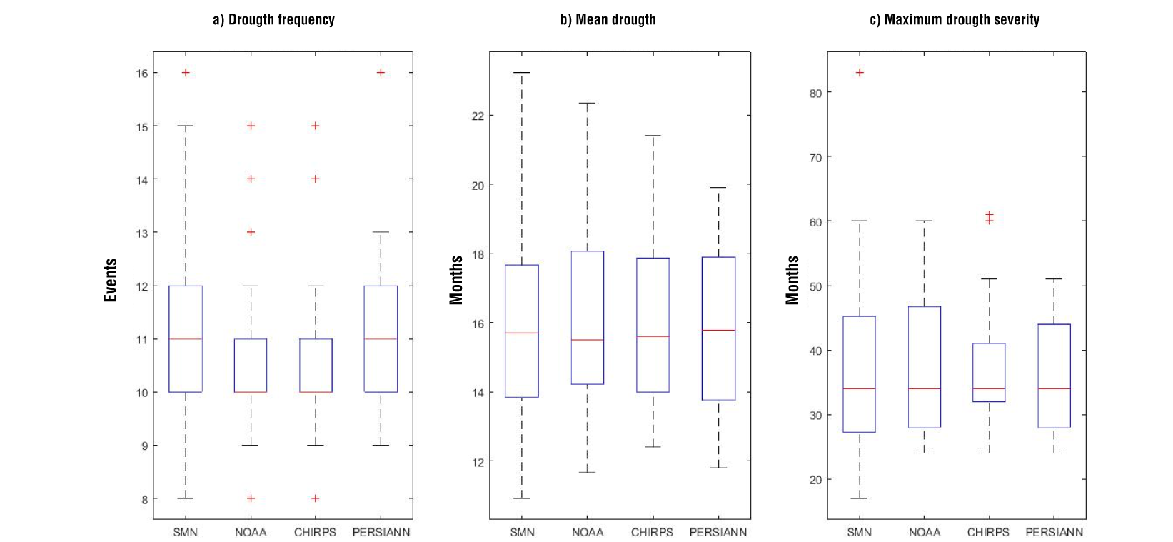 Figure 9 shows the boxplots corresponding to the drought indicators in the period 1983-2013. From this figure, we can see that the median of the drought frequency indicator is very similar among the selected precipitation datasets (five to six events), except for CHIRPS data, that presents seven events. In addition, NOAA data shows a larger range of events (from one to eight). The median value of the mean drought severity ranges from 13 (CHIRPS data) to 16 months (NOAA data), and the maximum drought severity ranges from 26 (NOAA data) to 29 months (CHIRPS data). Overall, all datasets show similar median indicators, but the range of the results is different among them, especially in the case of PERSIANN-CDR data which has the least variability in the severity indicators, that is, this dataset would underestimate or overestimate the number of months that a given drought would last. Similar results are reported in literature. For instance, Alijanian et al. (2019) observed, in a study conducted in Iran, differences in the number of total months with drought conditions, and in the maximum duration of the drought between PERSIANN-CDR and the gauge stations.