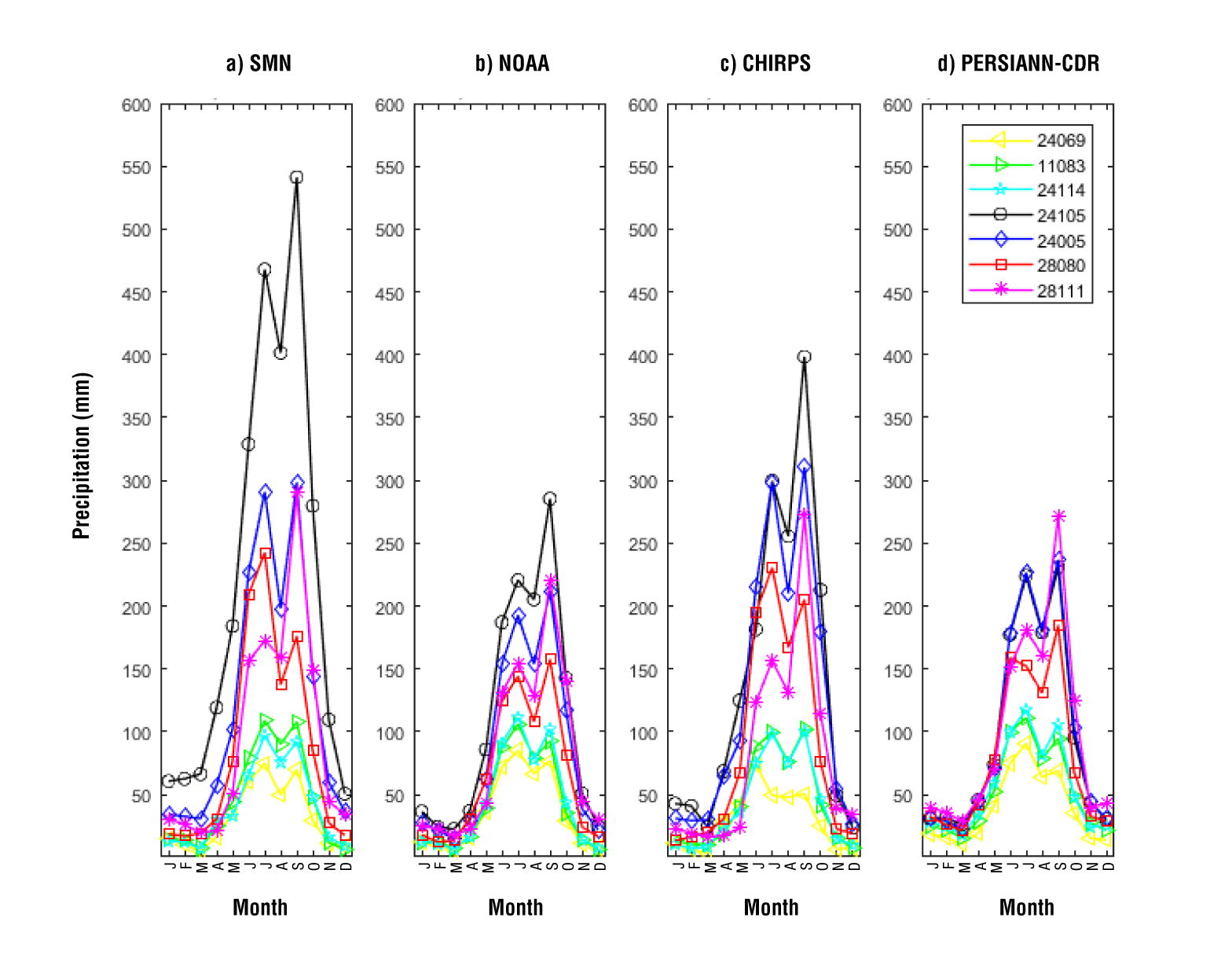 The observed precipitation records are homogeneous, based on the Helmert test (Campos-Aranda, 1988). The selected gridded precipitation datasets were compared with observations on their ability to capture the annual cycle for the period 1983-2013. Figure 2a shows the variability in the observed precipitation among the meteorological stations as they have different climate types. In general, the annual cycle has two peaks in July and September, with a decrease in August that corresponds to the midsummer drought (MSD). As mentioned by Magaña et al. (1999), the MSD does not correspond to a real period of drought but rather to a decrease in the amount of rain. The gridded precipitation datasets (Figure 2b to 2d) also capture the MSD and have a good overall representation of the annual cycle.