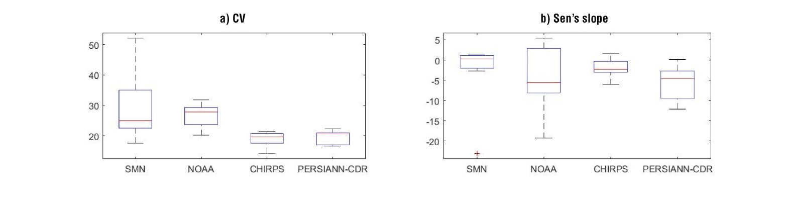 The differences in the variability of the data can also be seen in Figure 4a which shows the CV, so SMN data has the higher variability compared with the other datasets. In addition, Figure 4b shows the trend of the time series with the Sen’s slope (calculated on an annual basis). In general, SMN data shows no trend with a median value of 0.2 %, while NOAA data, CHIRPS data and PERSIANN-CDR data have median values of the Sen’s slope of -5.5, -2.3 and -4.6 %, respectively. The greater decrease trend was reported in station 24105 with SMN data (-23 %) and NOAA data (-19 %).