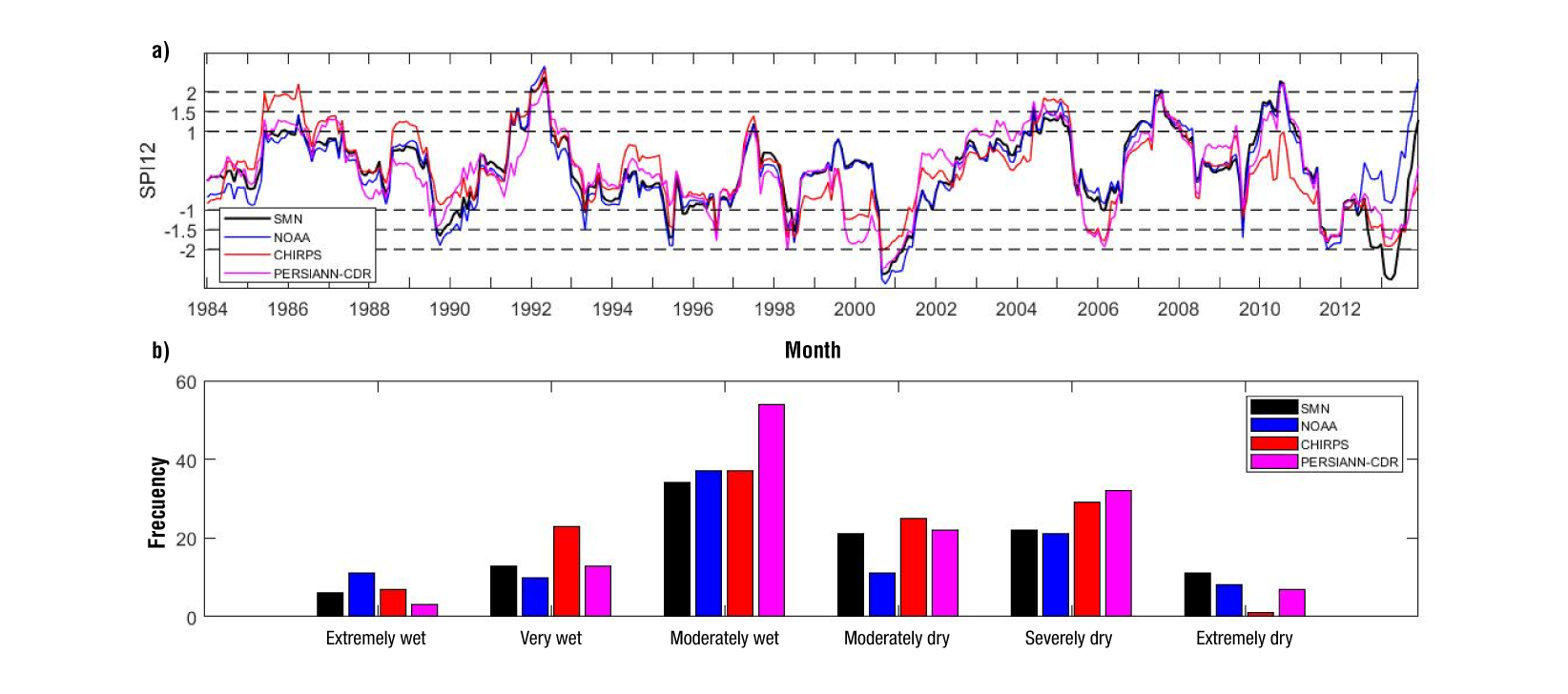 In general, Figure 5a shows a good agreement between the values obtained with the observations and the precipitation data, but some differences lead to a different classification. The observations classify the 1985-1986 period as moderately wet, while the CHIRPS data identify this period as extremely wet. Similarly, the observations define the 2006 period as near normal, while the SPI-12 obtained with NOAA and CHIRPS data classifies this year as severely dry. In general, NOAA data show good agreement with the SMN data, except for the period 2012 and 2013. The difference in SPI evaluated with the datasets is also evident in the frequency of events (Figure 5b). In this figure, a high frequency of very wet events can be observed with CHIRPS, and moderately wet with PERSIANN-CDR. On the other hand, the results show a low frequency of moderately dry events with NOAA, and extremely dry events with CHIRPS.
