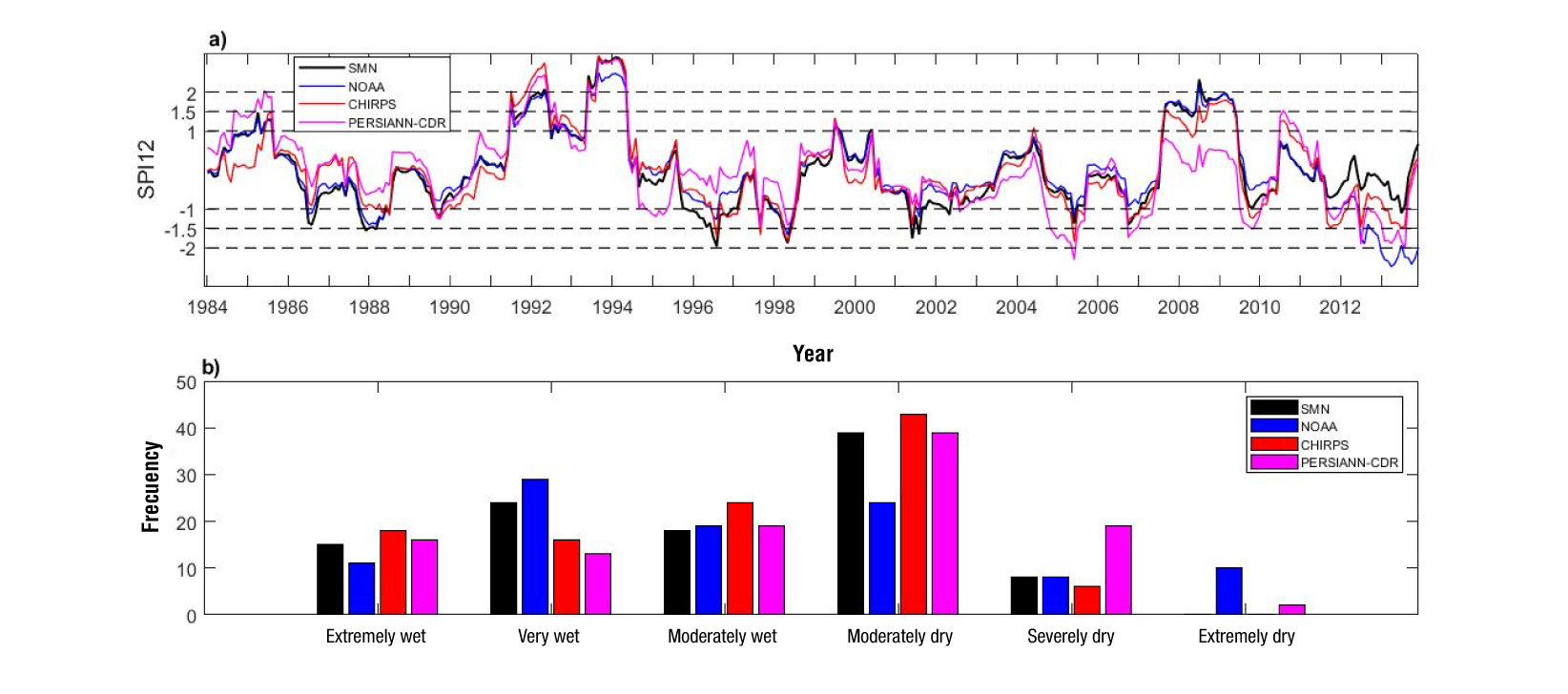 Similarly, Figure 6a shows the differences in the computation of wet and dry periods with the selected datasets for station 24005. For instance, the 1996-1997 dry period identified with observations is not well captured with CHIRPS data nor PERSIANN-CDR data, as these datasets identify this period as near normal. Another case is the 2012-2013 normal period which is reported as a dry period with the other datasets. Similarly, the dry period between 2007 and 2009 is not reported with PERSIANN-CDR data. The correlation coefficients for the SPI values obtained between SMN data and the other datasets are 0.89, 0.92 and 0.77 for NOAA data, CHIRPS data and PERSIANN-CDR data respectively. The differences in the frequency of the events are shown in Figure 6b. For example, NOAA data shows a high frequency of very wet events and low frequency of moderately dry events. On the other hand, extremely dry events were not reported with SMN data, but with NOAA data and PERSIANN-CDR data.