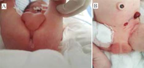 Figura 1 Bolsa escrotal íntegra con testículos en su interior, ano perforado con fístula uretrocutánea perianal (A), afalia con presencia de derivación intestinal (B).