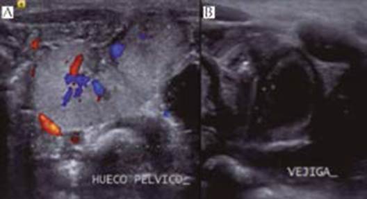 Figura 2 Riñón en el hueco pélvico con adecuado flujo Doppler (A), cavidad vesical con pared engrosada y conducto uretral (B).