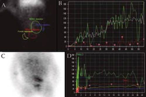 Figura 3 Gamagrama renal con MAG 3. Imagen lateral en fase de eliminación, donde se evidencia en verde el riñón derecho abdominal, en rojo el riñón izquierdo y en amarillo la vejiga (A), la gráfica de flujo (B), una toma anterior de la fase de perfusión (C), y la gráfica renográfica (D).