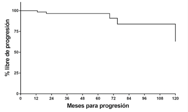 Seis pacientes tuvieron recurrencia local con una SLR del 98% y 89.3% a los 12 y 36 meses respectivamente (Figura 1); dichas recurrencias se trataron de la siguiente forma: cuatro con nefrectomía radical, uno con tumorectomía y el ultimo con radiofrecuencia. De los pacientes con recurrencia local ninguno tenía antecedente de margen positivo. La progresión de la enfermedad se presentó en cinco pacientes, dos de ellos a pulmón, dos a sistema nervioso central (SNC) y uno a hígado; la SLP fue de 96.5% a los 2 y 5 años (Figura 2); sin embargo, un paciente presentó progresión a 10 años de seguimiento. El factor que se asoció a progresión fue el grado nuclear (dos pacientes fueron grado 4; p=0.02).