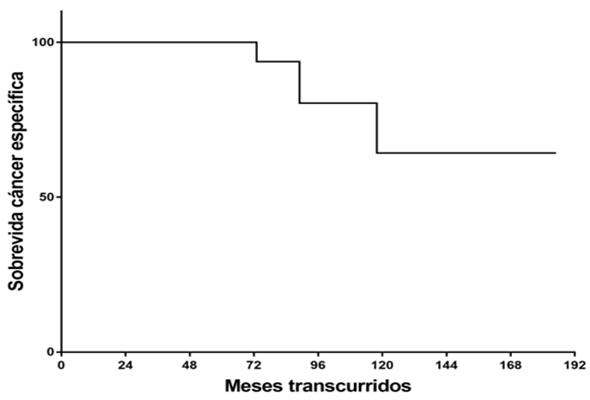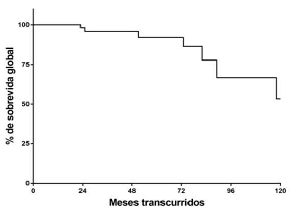 Durante el seguimiento seis pacientes fallecieron, de los cuáles, tres acaecieron por cáncer renal, de ellos, dos fueron los que presentaron progresión a SNC. La SCE fue del 100% a los 24 y 60 meses, del 80% a los 96 meses y del 64.3% a los 120 meses (Figura 3). Las otras tres muertes fueron por insuficiencia renal, segundo primario (sarcoma) y cardiopatía valvular; la SG fue de 98%, 92% y 53% a los dos, cinco y diez años (Figura 4).