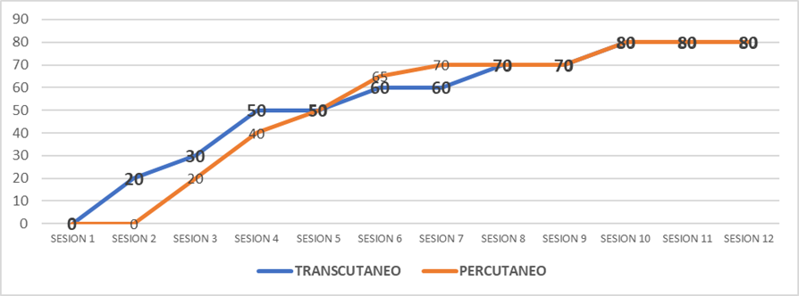 La percepción de mejoría por la paciente fue significativa en la sesión 2, transcutáneo 20 (0-30) y percutáneo 0 (0-30), p= 0.006; y en sesión 3, transcutáneo 30 (10-60) y percutáneo 20 (10-70), p= 0.044, el resto no fue significativo, sin embargo, el porcentaje de percepción de mejoría aumento en los 2 tratamientos (Figura 6).
