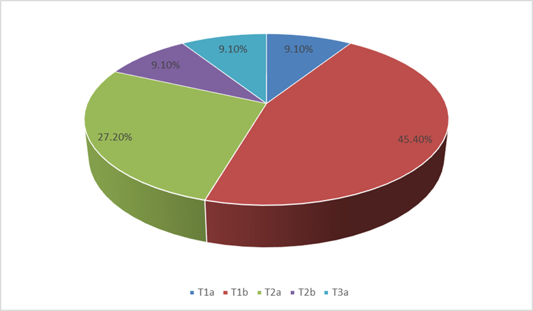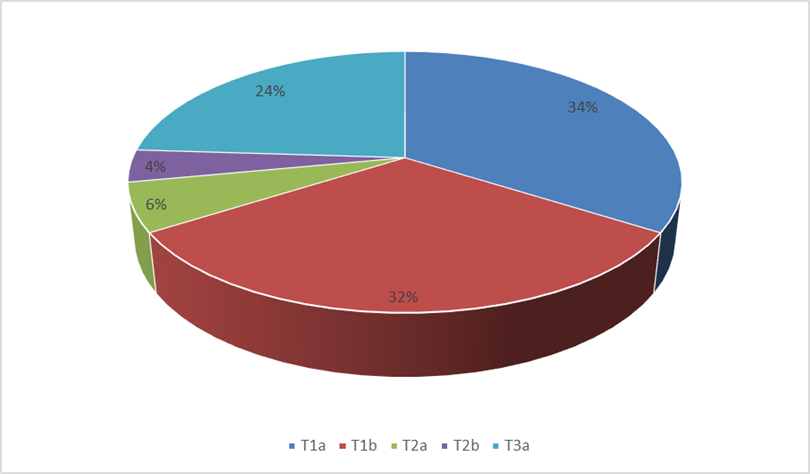Gráfica 5 Muestra la T de la clasificación TNM de acuerdo a las guías NCCN de los pacientes sometidos a Nefrectomía Radical Laparoscópica