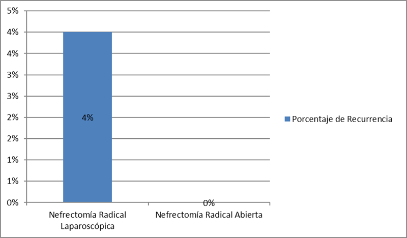 De las 50 nefrectomías laparoscópicas que se realizaron, 5 se convirtieron a cirugía abierta (10%), siendo el motivo más frecuente la hemorragia incontrolable con el 4%, seguido de lesión del diafragma, cardiopatía y la no identificación del hilio renal en el 2% para cada una, el promedio del tamaño del tumor para el abordaje laparoscópico fue menor que para el abierto (5.1 cm vs 6 cm), en ambos procedimientos el estadio clínico más frecuente fue el estadio clínico I, el sangrado promedio fue menor para el procedimiento laparoscópico que para el abierto (372 ml vs 419 ml), sin embargo, la duración promedio del evento quirúrgico fue mayor en la nefrectomía laparoscópica que en la nefrectomía abierta (164 vs 133 minutos), los días de estancia intrahospitalaria también fueron menos para el procedimiento laparoscópico que para el abierto (1.9 vs 3.7 días), de los pacientes sometidos a nefrectomía laparoscópica 39 elevaron los niveles de creatinina posterior al procedimiento quirúrgico y todos recuperaron la función renal durante el seguimiento, no así los que fueron sometidos a nefrectomía abierta que de 33 pacientes que elevaron creatinina posterior al procedimiento quirúrgico 3 (9%) no recuperaron la función renal y ameritaron diálisis peritoneal (Tabla 3) esto debido a factores de riesgo que presentaban los pacientes (diabetes mellitus e hipertensión arterial sistémica de larga evolución y en mal control y antecedentes familiares de enfermedad renal crónica), ya que no hubo diferencia estadística entre los promedios basales de creatinina entre los dos grupos y por lo tanto no se atribuye al abordaje realizado, dos de los pacientes sometidos a procedimiento laparoscópico tuvieron recurrencia de la enfermedad comparado con los pacientes sometidos a procedimiento abierto quienes no tuvieron recurrencia, hubo márgenes quirúrgicos positivos en un paciente con abordaje laparoscópico y en dos pacientes con abordaje abierto, fallecieron tres pacientes que fueron sometidos a nefrectomía laparoscópica (uno por hemorragia, absceso y sepsis) y dos que fueron sometidos a nefrectomía abierta.