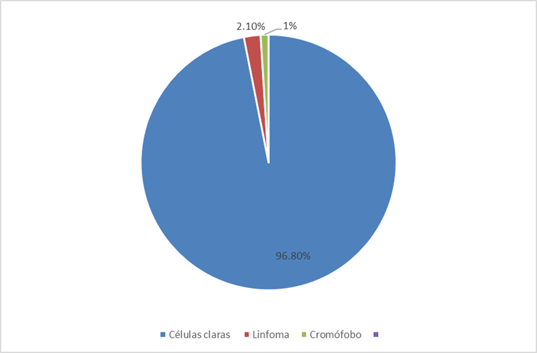 El carcinoma de células renales representa una entidad única con una variedad de aspectos histológicos. Los subtipos más comunes del carcinoma de células renales incluyen el convencional (células claras), papilar y el cromófobo.3