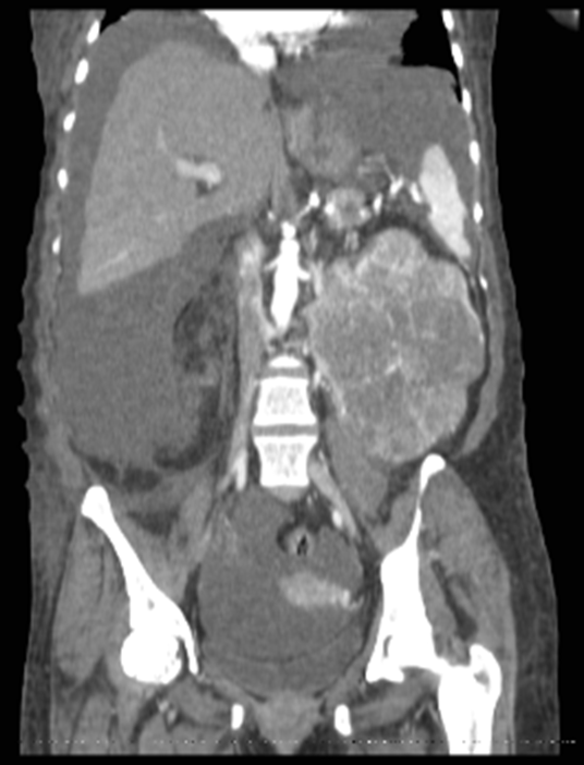 Los carcinomas renales de células claras crecen lentamente y los tumores pequeños menores de 3 cm tienen un riesgo bajo de metástasis, que ocurren con predominancia al hueso, pulmón e hígado. Actualmente, se recomienda la vigilancia activa hasta un tamaño umbral de 3 a 4 cm para la intervención quirúrgica, lo que da como resultado una tasa de supervivencia sin recurrencia del 76% a los 5 años y del 20% a los 8 años.12,13 Los pacientes con cáncer renal pueden desarrollar hematuria, dolor ardoroso lumbar o una masa palpable como signo o síntoma de presentación, sin embargo, puede manifestarse como en este caso, como una tumoración abdominal de crecimiento progresivo sin ningún otro tipo de síntoma.