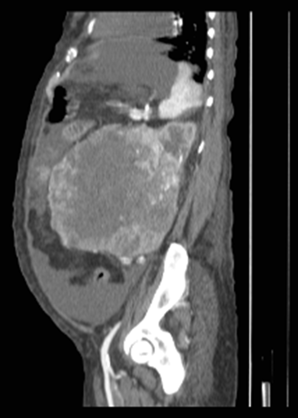 Inició su padecimiento un año previo a su diagnóstico presentando astenia, adinamia y distensión abdominal progresiva, sin embargo, al acudir a facultativo externo se asoció a la enfermedad tiroidea. A pesar del manejo presentó aparición de una tumoración en la región del flanco izquierdo con crecimiento progresivo. Por tal razón acudió a nuestra unidad donde se inició el abordaje diagnóstico, a través de la exploración física se encontró un abdomen globoso a expensas de tumoración de 25 por 15 cm en flanco izquierdo, desde el borde subcostal hasta 5 cm por debajo de cicatriz umbilical, dolorosa a la palpación y fija a planos profundos (Figura 1).