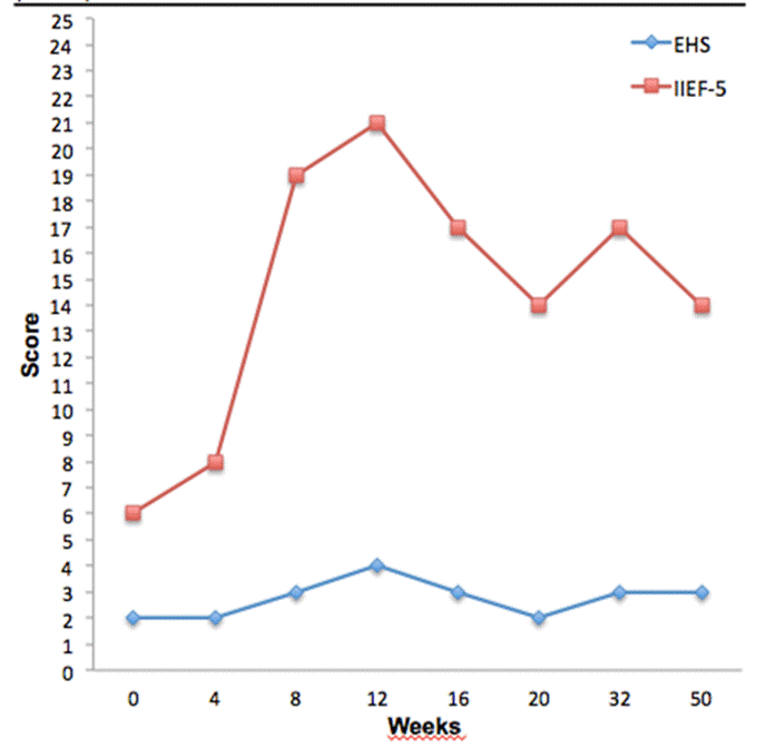 The highest scores during follow-up were at week 12, with an IIEF-5 score of 21 pts and an EHS of 4, classified as mild erectile dysfunction that was responsive to PDE-5 inhibitors. After week 12, the quality of the erections gradually declined. However, good response to PDE-5 inhibitors persisted over time.