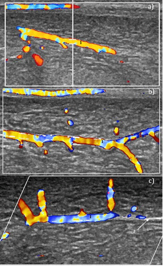 a) Right cavernous artery (RCA)1 pre-injection, with atheromatous plaque2, PSV= 4.61cm/s; b) RCA1 10 min post-injection, atheromatous plaque2 observed, PSV= 17.0cm/s; c) RCA1 20 min post-injection, PSV= 17.5cm/s. Irregular blood flow shown in a), b), and c).
