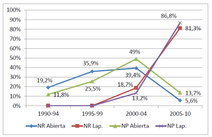 Los pacientes fueron tratados de la siguiente forma: 198 (41.3%) con NRA, 155 (32.3%) con NRL, 51(10.6%) con NPA y 76 (15.8%) con NPL. En la Figura 1 se puede observar la evolución de las distintas técnicas quirúrgicas en el periodo de tiempo del estudio.