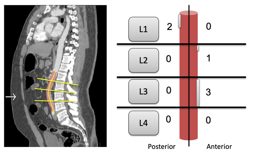Eight sections are obtained by splitting the abdominal aorta axially in the L1-L4 vertebral levels,4 which are then again divided into anterior and posterior sections.8 Each of the 8 sections is assessed for calcifications, and a 0-3 score is given as follows: 0, no calcifications; 1, up to 1/3; 2, more than 1/3; 3, more than 2/3. Then, all the sections values are added to get a final score between 0 and 24. The image provides an example of a score of 1 (L2 anterior), plus 2 (L1 posterior), and 3 (L3 anterior), thus a total Kauppila Score of 6.