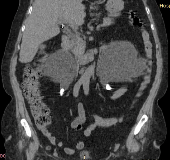 Femenino de 62 años acude a nuestra unidad con un único antecedente de importancia que es presentar cuadros de dolor en zona lumbar bilateral desde hace siete años tratados con analgésicos y controlando cuadros de manera parcial. En esta ocasión acudió a nuestra unidad con cuadro de dolor opresivo en zona lumbar bilateral de 72 horas de evolución que no sede con analgésicos. A la exploración física, tensión arterial de 120/70 mmHg frecuencia cardiaca de 100 latidos por minuto frecuencia respiratoria de 23 respiraciones por minuto y temperatura de 36. 5º Celsius. Glasgow de 15 puntos y maniobra de Giordano positiva bilateral. Se realizaron estudios de laboratorio (Tabla 1). El uroanálisis reporto eritrocitos incontables, sangre +++, nitritos negativos, esterasa leucocitaria 500 uL (negativo), bacterias moderadas y leucocitos 30-32 x campo. Ultrasonido renal bilateral (Figura 1. y Figura 2) se observa hidronefrosis renal bilateral grado IV. Se realiza tomografía computarizada abdominopélvica simple (Figura 3 y Figura 4) encontrando lito en uréter proximal izquierdo de 2.5 cm x 1.5 cm y lito en uréter proximal derecho de 1.5 cm x 9.50 mm como causa de hidronefrosis renal bilateral.
