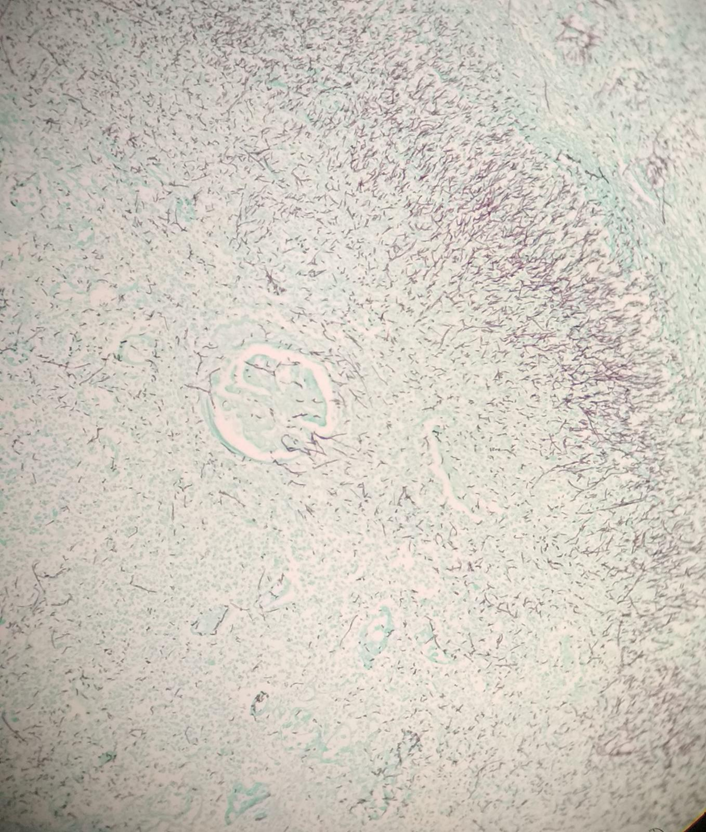 En nuestro caso, se realiza trasplantectomía (Imagen 3) cuyo análisis histopatológico arrojó la posibilidad de aspergilosis, iniciando tratamiento con anfotericina B e isovuconazol; este último agente no ha sido aprobado para el tratamiento de la escedosporiosis por la FDA pero los datos in vitro sugieren que puede tener una buena actividad.25