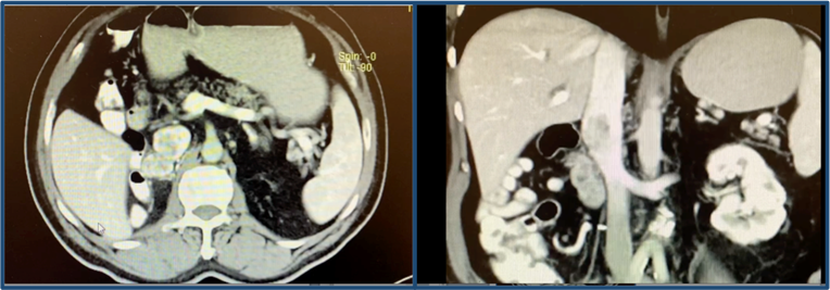 Se trata de masculino de 65 años, asintomático ECOG 0, con antecedente de nefrectomía radical derecha laparoscópica en 2017, secundaria a tumor renal derecho visualizado por tomografía abdomino pélvica simple y contrastada de 10 x 8 cm con resultado histopatológico para carcinoma renal de células claras sin componente rabdoide ni sarcomatoide con Fuhrman 2 y una estadificación patológica pT3aN0M0 margen positivo en vena renal. En seguimiento con tomografía contrastada cada 6 meses en sus primeros tres años, luego anuales, en julio 2022 se observa imagen lobulada derecha de 4.6 x 4.2 x 2.2 cm heterogénea con realce al contraste, que pierde plano de separación con vena cava inferior e infiltra su luz, a nivel subdiafragmático II de la clasificación Neves-Zincke, sin evidencia de otra lesión, ni ganglionar o a distancia, por lo que se protocolizó para realizar, metastasectomía con trombectomía por vía laparoscópica. Figura 1