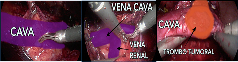 El trombo debe disecarse cuidando evitar diseminación y el ostium de la vena renal, así como la vena en sí, deben resecarse en bloc junto con el riñón derecho (el cuál se embolsa previamente) y debe ser embolsado de forma inmediata). Posterior a la resección, la luz caval debe ser irrigada con heparina previo al cierre con Tex 5-0 (W. L. Gore & Associates, Newark, DE, USA). Los torniquetes se liberan en orden secuencial: arteria renal izquierda, VCI suprarrenal, VCI infrarrenal. En el mismo estudio se reportó una cirugía exitosa en el 96% de los pacientes y solo una reconversión (4%) describiendo esta cirugía como el procedimiento urológico de mínima invasión más retador, sin embargo con resultados alentadores para continuar realizándose por vías mínimamente invasivas.13