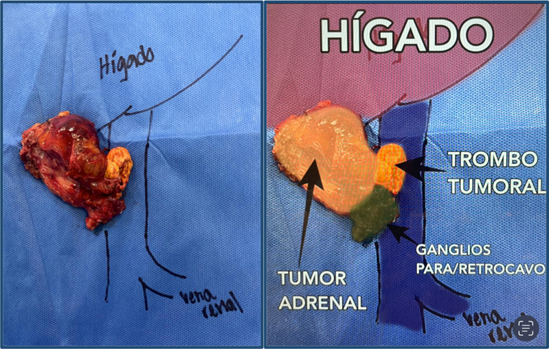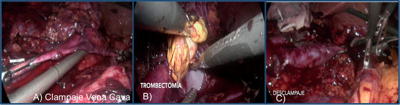 Se localiza la lesión tumoral adrenal derecha la cual se diseca en su circunferencia respetando sus márgenes. Una vez completado lo anterior se inicia el control vascular de la siguiente manera 1) se realiza clampaje de la vena cava inferior 2) posteriormente se coloca clamp en cava superior retrohepática 3) debido a la disposición anatómica de la vena renal contralateral (renal izquierda baja), por lo que no requirió de clampaje selectivo de dicha vena. La vena renal derecha de la nefrectomía previa no requirió de clampaje, pues es la zona de recurrencia tumoral y trombo que además contaba con Hem-o-lok® previos de la nefrectomía inicial. Se realizó cavotomía con tijera laparoscópica y se visualizó trombo tumoral amarillo mostaza el cual se disecó romo de la pared de la vena cava por completo excepto en el margen próximo a la lesión adrenal ameritó resección de margen de cava dejando un buen margen sin lesión.