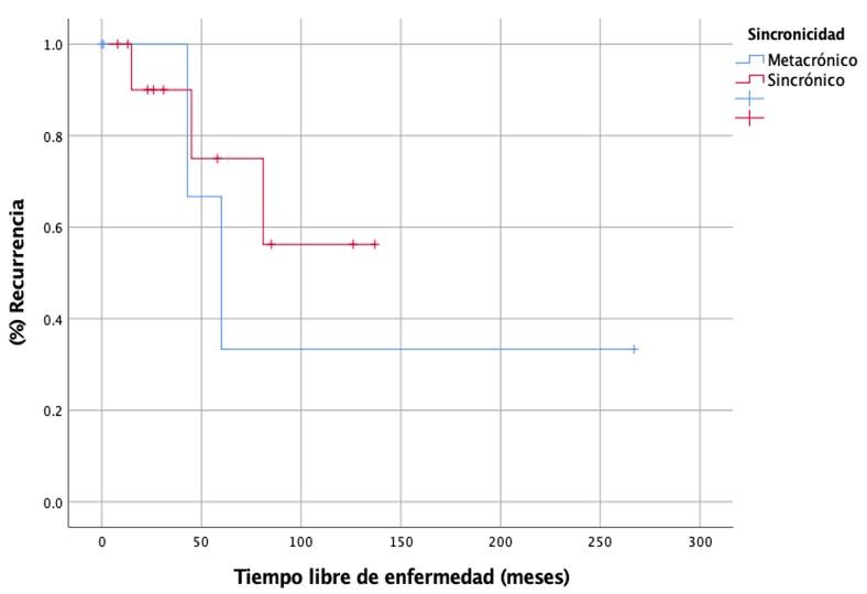 La media de SG fue de 67.5 meses y la de SLR de 43 meses. La mediana de supervivencia de los sincrónicos fue de 45 meses y de 71 meses en el caso de los metacrónicos, sin embargo la SLR fue mayor en los metacrónicos (40% versus 25%).