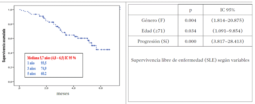 Se evaluó también en la muestra el tiempo hasta la ocurrencia de progresión. Se estimó una media de 5,1 años. La tasa de pacientes libres de progresión de la enfermedad se mantiene en un 60.1 % a partir de los 6 años, lo que indica que alrededor del 40 % de los pacientes progresa en los primeros 5 años, Gráfico 1.