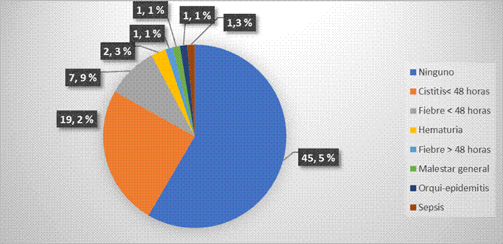 En el análisis de seguridad no se reportó eventos adversos en el 45.5% de los pacientes. La cistitis se presentó en el 19.2% de los pacientes y la fiebre en el 7.9%, ambas toxicidades se observaron con una duración de 24 a 48 horas después de la administración intravesical. Se informó de la presencia de hematuria tras la administración en solo el 2.3% de los pacientes. Los eventos restantes se constataron en un paciente, cada uno. Ninguno de los eventos adversos se clasificó como grave o serio que comprometiera la vida de los pacientes (Gráfico 2).