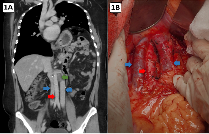 Figura 1A. Corte coronal de tomografía abdominal, donde se observa tumor retroperitoneal (flecha verde), doble vena cava inferior (flecha azul) y arteria aorta (flecha roja). Figura 1B. fotografía de cirugía donde se observa doble vena cava inferior (flecha azul) y aorta abdominal (flecha roja).