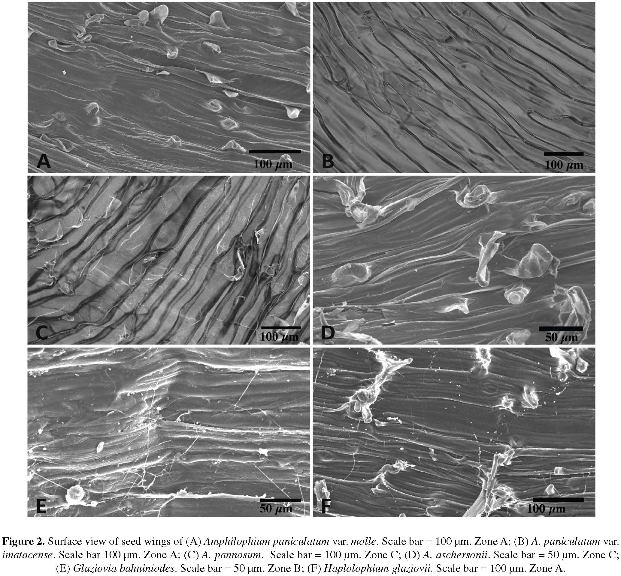 Scanning Electron Microscopy (SEM). Fragments from the three regions of the seed wing indicated in Figure 1 were removed. Afterwards they were placed on a brass microscope sample holder, sputter-coated with gold-palladium in a JEOL Fine Coat JFC-1100 device, and then observed and photographed at various magnifications under a JEOL JSM 5600 LV electron microscope.