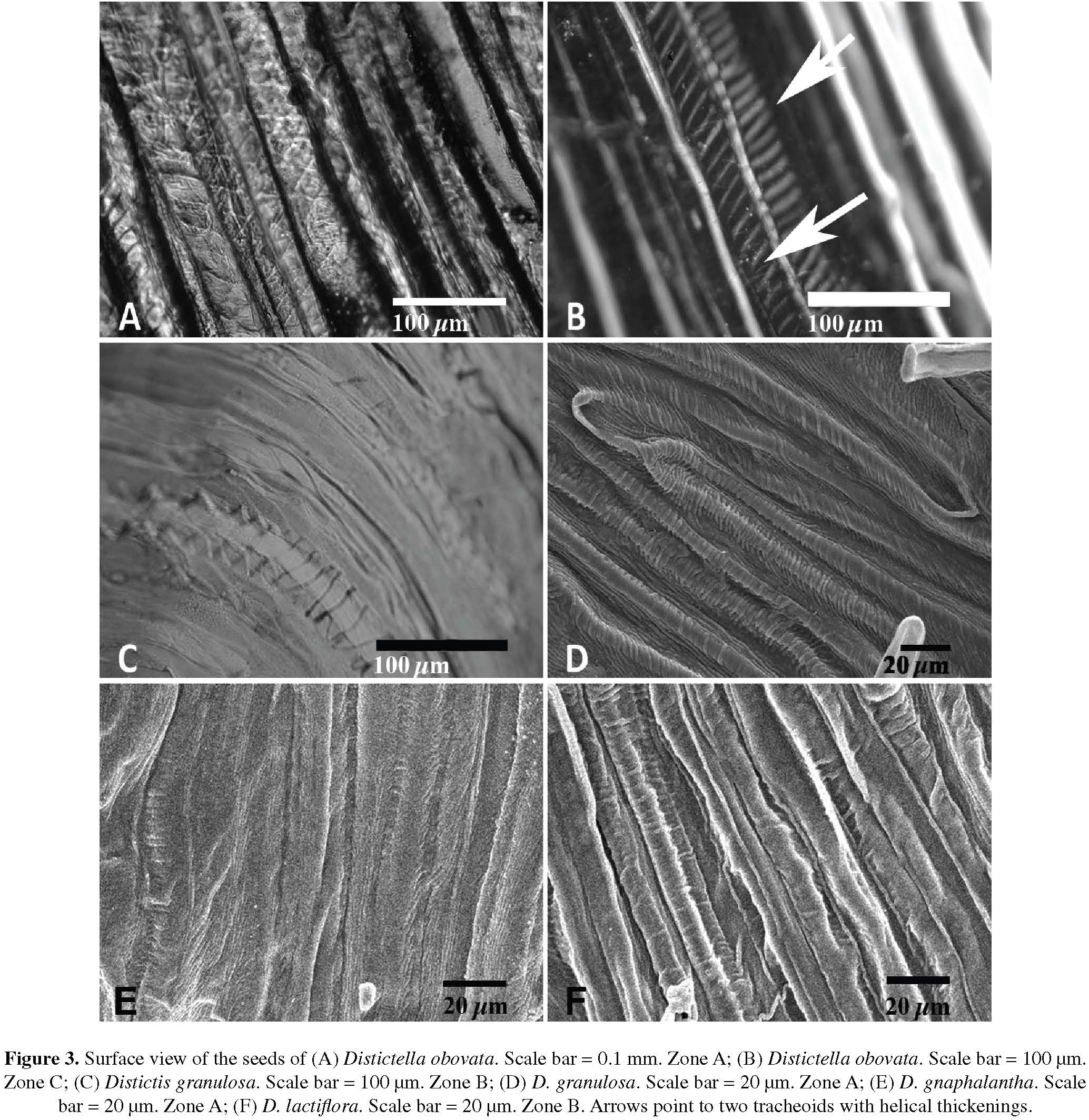 Distictis and Distictella, genera that have ornamented tracheoids with complete helices, were originally described as a sole taxon; according to Bureau (1864) and Schumann (1894), the nature of their fruits and seeds is what distinguishes them from other genera in the subtribe. Gentry (1976) suggested that Distictella and Distictis should not be considered separate genera. In this case, Lohmann (2006) found that Distictella is (based on the low number of species surveyed) apparently monophyletic and distinct from Distictis. Anyhow, the presence of helical-thickened walls of tracheoids in the seeds of the species of these genera should be taken into account in future phylogenetic analyses of the subtribe in order to take the best taxonomic decisions.