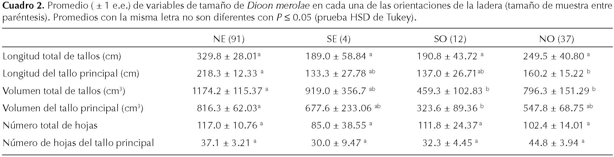 Distribución espacial. La presencia de Dioon merolae no es uniforme alrededor de los montículos o promontorios rocosos en lo que se distribuye. Un mayor número de individuos se encuentra en las laderas orientadas al N (tanto NE como NO); además, en estas mismas exposiciones se encuentra una mayor amplitud en el tamaño de los individuos. Las condiciones microambientales que se asocian a las laderas de orientación N (en el hemisferio N), incluyen una menor insolación y la posibilidad de que ahí las plantas encuentren microambientes con temperaturas más bajas y humedad relativa y edáfica más alta que en las laderas de exposición S (Holland y Steyn, 1975; Barbour et al., 1999). Es posible que en las laderas de exposición sur del área de estudio la escasa humedad durante la temporada seca del invierno y la primavera, donde además se presentan las mayores temperaturas durante la primavera, sólo puedan ser toleradas por las especies arbóreas caducifolias. Hacia el fin de la temporada seca (abril a junio) estas condiciones ambientales extremas en las laderas de exposición sur pueden representar una carga calórica sobre las hojas y ocasionar un desbalance hídrico en una especie perenne como D. merolae. Aunque en la época lluviosa la cobertura arbórea en las laderas de exposición norte puede representar una competencia más intensa por luz, agua y nutrimentos sobre D. merolae, es posible que la distribución observada se deba a una mayor supervivencia y crecimiento ante condiciones de relativamente menor temperatura y mayor humedad en las laderas norte en la época seca que en las laderas sur. Una prueba experimental de esta hipótesis podría efectuarse al cabo de un plazo de pocos años después de trasplantar juveniles en las laderas con diferente orientación y registrar su supervivencia y crecimiento.