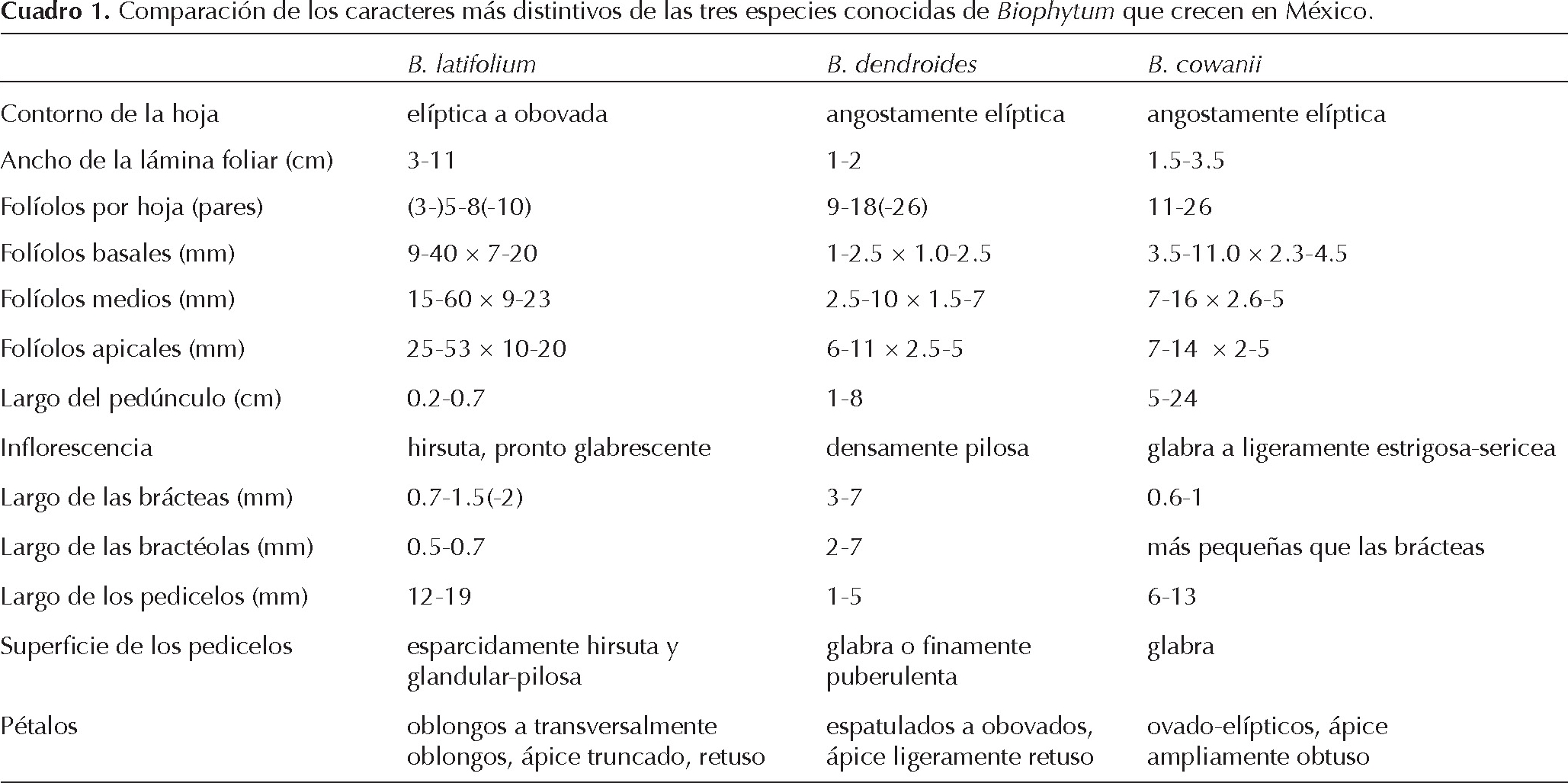 Considerando lo anterior, resulta interesante observar que Biophytum latifolium tiene mayor parecido morfológico con especies que se encuentran distantes geográficamente hablando; una situación semejante a lo que halló Wendt (1987) sobre las relaciones de B. cowanii. Aunque se esperaría mayor relación con especies simpátricas, éstas (B. cowanii y B. dendroides (Kunth) DC.) son sustancialmente diferentes (Cuadro 1). En realidad es difícil establecer con base en la morfología con cuál especie tiene mayor relación B. latifolium. Igualmente, la forma en que se combinan los rasgos de las diferentes estructuras en esta especie no encaja del todo con alguno de los patrones reconocidos para las secciones del género propuestas por Knuth (1930). Con base en la morfología de su tallo e inflorescencias (tallos aéreos simples y pedúnculos o pedicelos reducidos), B. latifolium debería considerarse en la sección Dendroidea Knuth, pero las dimensiones de sus hojas (con folíolos de hasta 6 × 2.3 cm) la ubicarían en la sección Grandifoliolata Knuth (cuyas inflorescencias tienen pedúnculos de varios centímetros de largo). Es claro, sin embargo, que la morfología de los folíolos de B. latifolium (angostamente oblongo-elípticos, obtusos a agudos en el ápice y mucronados) la relacionan más con la sección Dendroidea que con Grandifoliolata (de folíolos más bien oblongos y truncados a ligeramente redondeados en el ápice). Pareciera entonces necesario revisar la sistemática del género a fin de precisar mejor los subgrupos naturales dentro del mismo y esclarecer cuáles son los rasgos que les dan identidad y que en consecuencia los distinguen y relacionan entre sí.