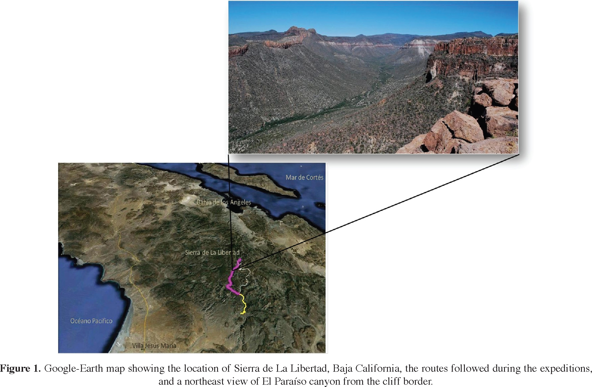 Based on this partial and incomplete information we explored these mountain ranges by air in 2006. From the air, we identified the main El Paraíso Canyon, its tributaries, and many remote blue fan palm oases, but we could not see any roads to reach them. In April and October of 2009, we entered the area by mule with the main objective of surveying and documenting the local ecosystems and their vegetation (Figure 1). Voucher specimens of the flora collected in both expeditions are deposited in the herbaria of the San Diego Natural History (SD) and the Universidad Autónoma de Baja California (BCMEX), in Ensenada, Mexico.