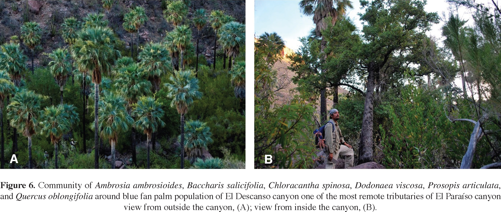Communities living along the canyons. Before reaching El Paraíso Canyon we surveyed the northern part of arroyo El Toro (635 m), which has many patches of blue fan palms imbedded on an arid matrix composed of Aesculus parryi, Agave shawii ssp. goldmaniana, Cylindropuntia alcahes, C. cholla, Fouquieria columnaris, and Pachycereus pringlei. Along the canyon and associated with Brahea armata we recorded Ambrosia ambrosioides, Baccharis salicifolia, B. sarothroides, Chloracantha spinosa, Dodonaea viscosa, Proso-pis articulata, and Vachellia farnesiana. A rare collection was the climbing Macroptilium atropurpureum (Fabaceae) with dark purple flowers, which constituted a new record for BC. By walking down several mesas through a volcanic substrate covered by populations of C. cholla, Encelia farinosa, F. columnaris, and P. pringlei we reached the El Paraíso main stream where we found the abandoned San Bartolo ranch at an altitude of 500 m. Here the substrate becomes granitic and the species guild associated with B. armata was composed of particular riparian populations of A. ambrosioides, B. salicifolia, C. spinosa, D. viscosa, P. articulata, and V. farnesiana. Around the ranch we also found date palms, Phoenix dactylifera, introduced by the former inhabitants of the area and the perennial grass Phragmites australis reaching 2 m high. Continuing along the El Paraíso Canyon and after crossing an area with ancient cave paintings we reached the Santa Marta area at 750 m, where once a ranch was settled. Date palms, P. dactylifera of several age-size categories congregate here in high densities. We continued to El Paraíso Viejo, another abandoned ranch where we found 12 new plant records for the northern BC state including the new species of Cylindropuntia. This new and undescribed species reproduces very well vegetatively and interestingly, the fleshy fruits that fall to the ground and were not eaten by animals can develop roots and establish as new clonal individuals. Further along El Paraíso Canyon, blue fan palm concentrations increased as well as those of wild figs, Ficus palmeri. In April, several plant species were flowering including blue fan palms and the cochal cactus Myrtillocactus cochal, the scent of which was very strong along the way. Along a tributary, arroyo El Descanso (870 m), blue fan palms were particularly tall and dense, and the community around them included A. ambrosioides, B. salicifolia, C. spinosa, D. viscosa, P. articulata, Toxicodendron diversilobum, and oaks, Quercus oblongifolia (Figure 6). This spot has an important water hole; the canyon is very humid and deep reducing the number of light hours in it, probably determining the height of these palms (Figure 6). On the floor, we found several blue fan palm seeds oviposited by the larvae of the beetle Coryobruchus veseyi Horn (Bruchidae; see Wehncke et al., 2009).