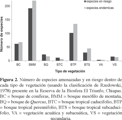 El bosque mesófilo de montaña es el tipo de vegetación más importante por el número de especies endémicas y en riesgo de la REBITRI. Esto tiene sus implicaciones en la conservación de las especies listadas, principalmente porque aproximadamente 43% de las endémicas y en riesgo han sido reportados de este tipo de vegetación y 35% del total tienen como única referencia este ecosistema. Esto resalta la importancia de este ecosistema por su enorme riqueza de especies endémicas y en riesgo, y en general de una alta biodiversidad que ha sido reconocido para los bosques mesófilo montaña de México (Rzedowski, 1996; Luna-Vega et al., 2001; González-Espinosa et al., 2011).