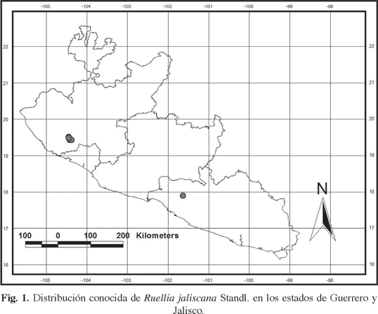 La distribución disyunta de Ruellia jaliscana en el estado de Guerrero y en el estado de Jalisco concuerda con el registro de Acer saccharum Marshall subsp. skutchii (Rehder) A.E. Murray recolectado también en Guerrero, en el municipio de Coahuayutla (Mayorga 1519, FCME, MEXU, IEB), y mencionado por Vargas-Rodríguez (2011) donde se señala que la especie era sólo conocida de la Sierra de Manantlán y Talpa de Allende en el estado de Jalisco. Asimismo, la reciente publicación de Lepidagathis danielli R.Cruz y J.Jiménez-Ram. (Cruz-Durán y Jiménez-Ramírez, 2011b) y Holographis lizethae R.Cruz y J.Jiménez-Ram. (Cruz-Durán y Jiménez-Ramírez, 2011a) en el estado de Guerrero es un indicativo que en el estado todavía queda mucho por conocer para la familia Acanthaceae.