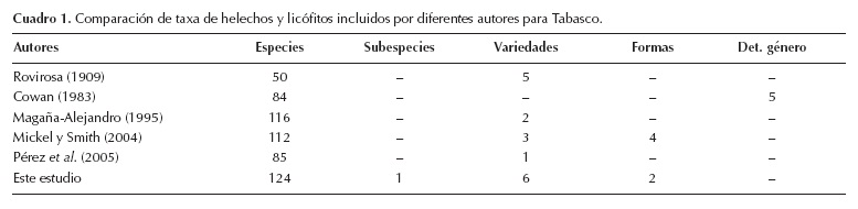 Las primeras recolecciones de helechos y licófitos en Tabasco se realizaron en Huimanguillo, Macuspana y Teapa por Ghiesbreght en 1862-1865 y posteriormente por Linden en 1890 (Rovirosa, 1909). El primer estudio formal de los helechos de Tabasco fue realizado por el botánico tabasqueño José Rovirosa (1909), y presentado en su obra Pteridografía del sur de México. Posteriormente Cowan (1983) incluyó los helechos y licófitos en la Flora de Tabasco. En estudios recientes, como los realizados por Magaña-Alejandro (1992), Mickel y Smith (2004) y Pérez et al. (2005), se han registrado diferentes números de especies de helechos y licófitos para el estado (Cuadro 1). Hasta el momento, no hay consenso en cuanto al número de especies; además, todos estos trabajos están basados principalmente en las colecciones de Rovirosa y de Cowan, lo que indica que no se han realizado nuevas recolectas y actualizaciones taxonómicas. Los helechos y licófitos en Tabasco representan un grupo de interés histórico, debido a que Rovirosa (1909) fue el primer botánico que se enfocó a estudiarlos para el estado y, posterior a su trabajo, han sido poco recolectados y estudiados (Magaña-Alejandro, 1992). El objetivo de este estudio fue inventariar los helechos y licófitos presentes en los fragmentos de selva mediana subperennifolia para contribuir al conocimiento de la flora de Tabasco.