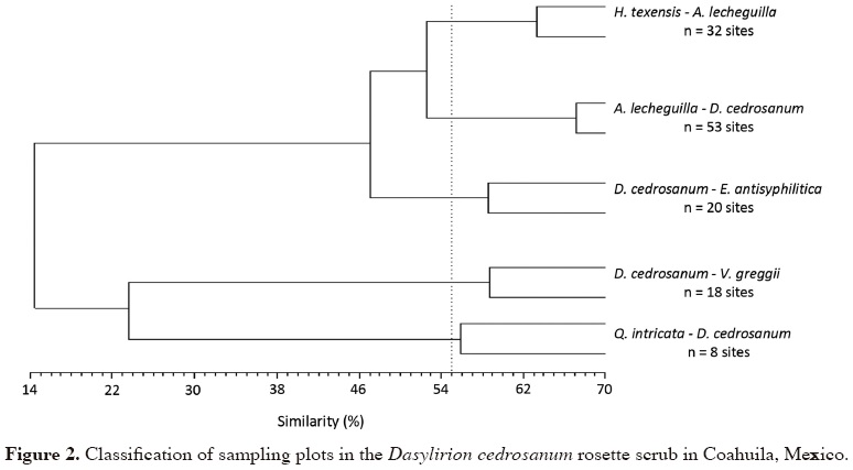 Site classification. The classification of the sampling sites allowed us to differentiate five vegetation variants at the cutoff level of 55%, which were interpreted as plant associations of the Dasylirion cedrosanum rosette scrub (Figure 2). In general, these associations occurred along an elevational gradient that increased from top to bottom in the dendrogram, from 850 to 2,530 m a.s.l. The first three associations comprised 105 sites (80% of the total); their mean elevation was lower than 1,600 m a.s.l., and they were characterized by the dominance of low, rosette-like shrubs, in addition to some succulent species. Conversely, the remaining two associations occurred above the 1,600 m contour and were dominated mostly by microphyllous and sclerophyllous shrubs and trees.