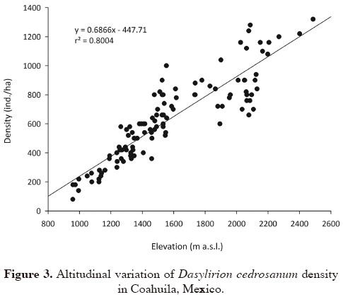 Density and distribution of Dasylirion cedrosanum. The elevational range displayed by D. cedrosanum in Coahuila is very broad (850-2,530 m a.s.l.). Along this gradient its density increases linearly at an approximate rate of 68 ind./ha for every 100 m increase in elevation (Figure 3). Mean density at elevations < 1,000 m was always < 200 ind./ha, whereas at higher elevations (2,000-2,500 m a.s.l.) densities ranged from 900 to 1,200 ind./ha. Dasylirion cedrosanum reached its highest abundance in the mountains located in southern Coahuila, on the Eastern Sierra Madre, whereas the lowest densities were recorded in the sierras of Central Coahuila, in the Mexican Plateau Physiographic Province.