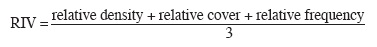 We constructed a matrix containing density values of 90 species occurring in all sampling sites, with which we performed a cluster analysis using Ward's method (Minimum Variance), an agglomerative, polythetic, and hierarchical classification procedure (Ward, 1963; Manly, 1986). The classification was performed with NTSYSpc ver. 2.0 (Rohlf, 1998). Between plot similarities were calculated with the Morisita Index. For each group of plots interpreted as a plant association, we calculated density, frequency, and crown cover for each species; relative values of these variables were summed in order to calculate Relative Importance Values (RIV; Mueller-Dombois and Ellenberg, 1974), according to the following formula: